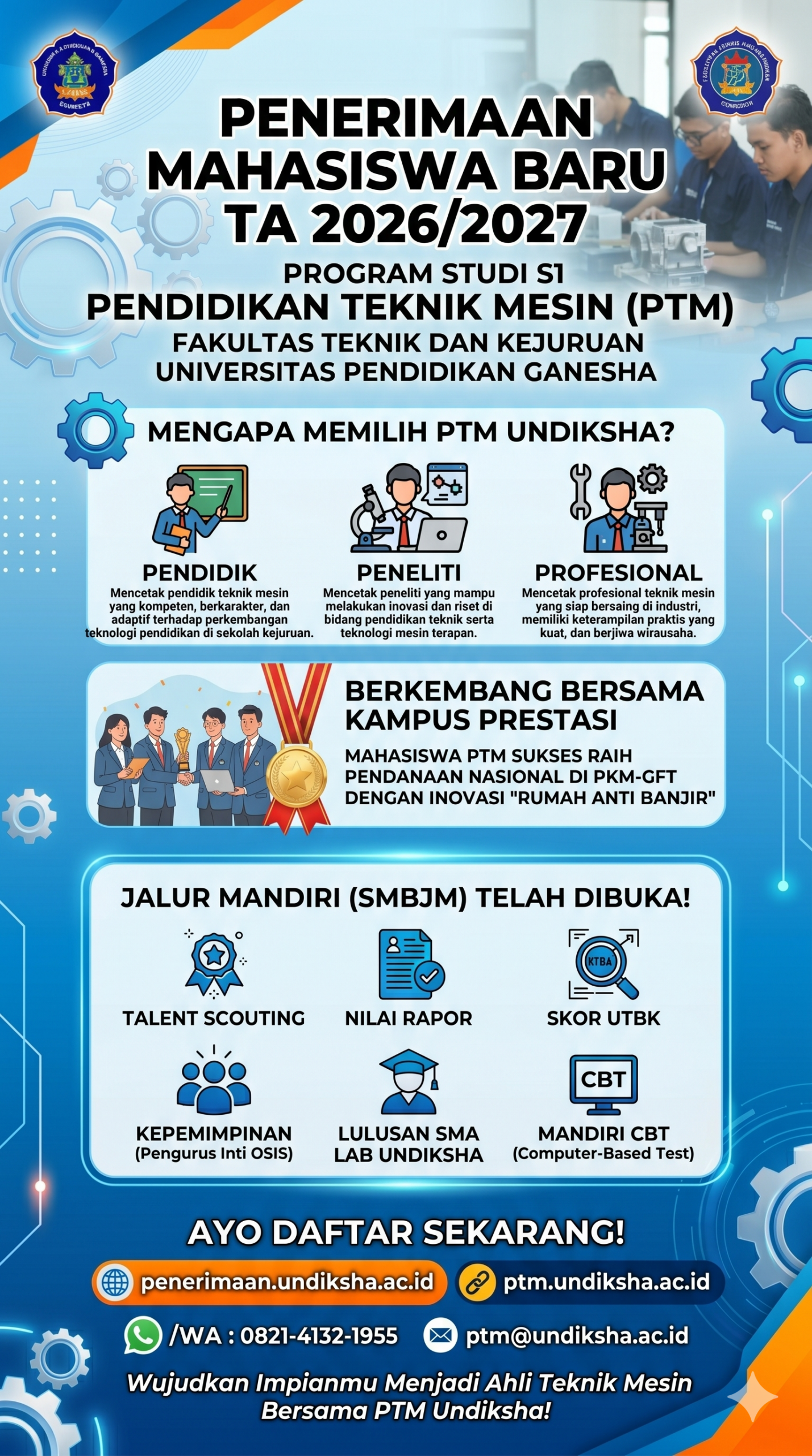 Program Studi Pendidikan Teknik Mesin Universitas Pendidikan Ganesha saat ini terus berkembang dan telah meluluskan mahasiswa yang bekerja diberbagai bidang, sehingga menjadi pilihan yang tepat sebagai tempat untuk mengembangkan diri dan menimba ilmu pengetahuan demi masa depan anda dalam rangka mengabdikan diri kepada Bangsa dan Negara.